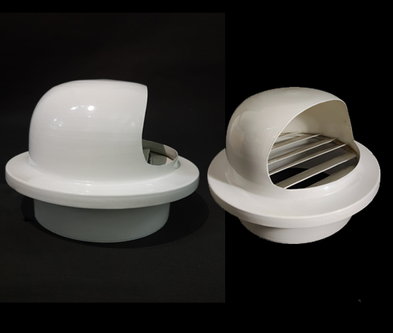 Round wall outlet ventilation grille for use with extraction or input ventilation systems, can be used as apart of along ductwork run for a variety of purposes including whole house ventilation, passive stack vent, positive input ventilation, air conditioning, HVAC.