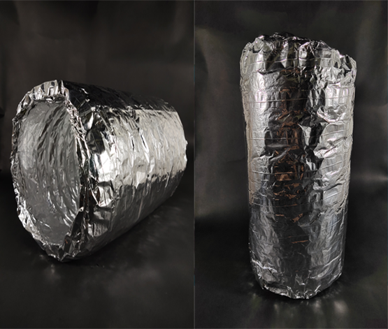 This type of silencer uses perforated aluminium foil which encapsulates the helical spring wire as the inner core, fiberglass insulation and helical spring wire supported aluminium foil for the outer duct which gives a good sound absorption.